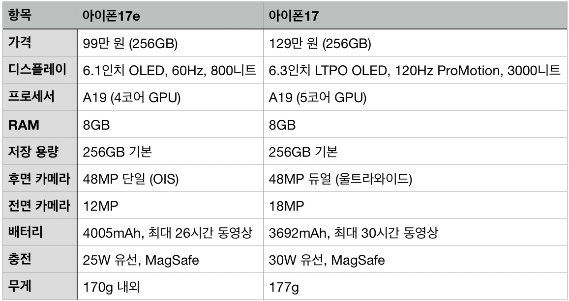 17e는 기본 용량과 MagSafe를 강화해 실속형으로 업그레이드됐으나, 17은 화면 부드러움과 밝기에서 앞서며 더 넓은 활용성을 제공합니다.
