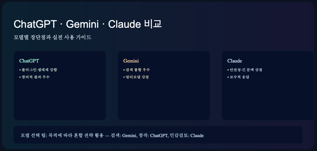 오늘날 주류 대형언어모델(LLM)은 OpenAI의 ChatGPT, Google의 Gemini, Anthropic의 Claude 등으로 요약됩니다. 각 모델은 설계 철학, 응답 스타일, 도구 통합 능력, 안전성·규모 등에서 차이를 보입니다. 이 글은 실무·개인 사용 관점에서 세 모델의 특징을 정리하고, 어떤 상황에 어떤 모델을 선택하면 좋은지 실전 팁을 제공합니다.1. 전반적 비교(한눈에)ChatGPT (OpenAI): 광범위한 생태계(플러그인, API, 도구 통합)와 안정적인 일반·대화 능력이 강점. 창의적 글쓰기, 코딩 보조, 상담형 대화에서 좋음.Gemini (Google): 구글의 검색·지식그래프·멀티모달 기능과 결합된 '검색+생성' 강자. 실시간 검색, 멀티모달 입력(이미지+텍스트)에서 강함.Cl..